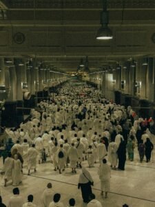 Before stepping into the sacred boundaries of Makkah, pilgrims must enter the state of Ihram. This is both a physical and spiritual preparation for Hajj. Men wear two unstitched white sheets — one wrapped around the waist and the other over the shoulders — while women remain in their modest clothing, covering their entire body except for the face and hands. At this stage, every pilgrim makes the intention to perform Hajj, entering a state of purity and devotion.